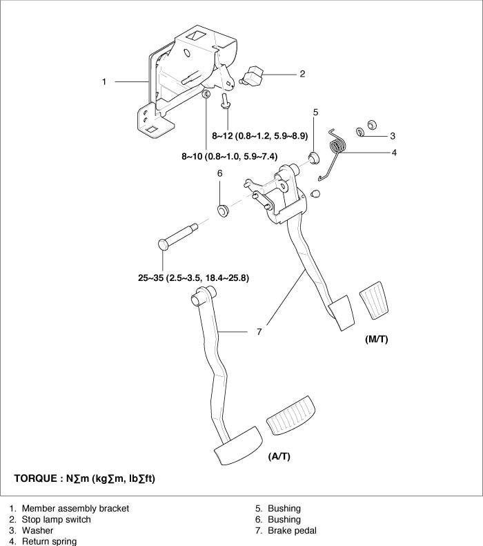 5. Remove the brake pedal member assembly mounting nuts and then remove the brake pedal assembly.