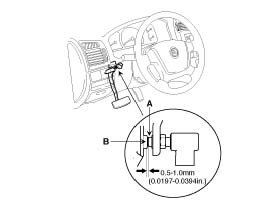 4. After turning the stop lamp switch (A) until it contacts the brake pedal stopper (B) (just before the brake pedal is caused to move), return the stop lamp switch 1/2 to 1 turn and secure by tightening the lock nut.
