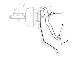 1. With the engine stopped, depress the brake pedal two or three times. After eliminating the vacuum in the power brake booster, press the pedal down by hand, and confirm that the amount of movement before resistance is met (the free play) is within the standard value.