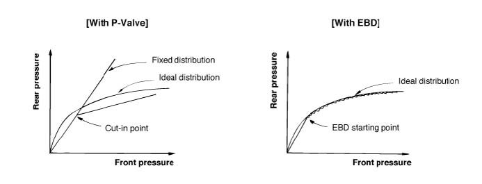 EBD controlled by the ABS Control Module, calculates the slip ratio of each wheel at all times and controls the brake pressure of the rear wheels not to exceed that of the front wheels.