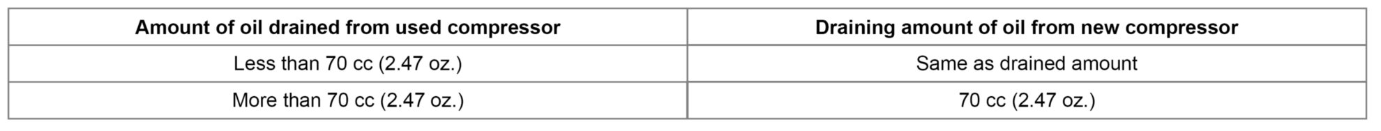 150 cc (5.29 oz.) of oil is charged in compressor (service parts). So it is necessary to drain the proper amount of oil from the new compressor.