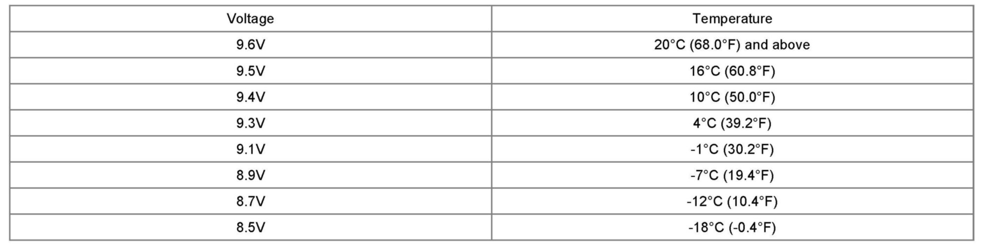 5. Compare the voltage reading with the minimum and replace the battery if battery test voltage is below that shown in the voltage table.
