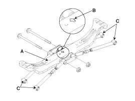 Rear suspension arm (C) to-rear carrier bolts should be temporarily tightened, and then fully tightened with the vehicle on the ground in unloaded condition.