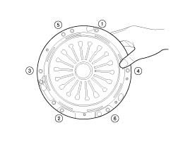 3. Install the clutch cover assembly to the flywheel and temporarily tighten the bolts one or two steps at a time in a star pattern.