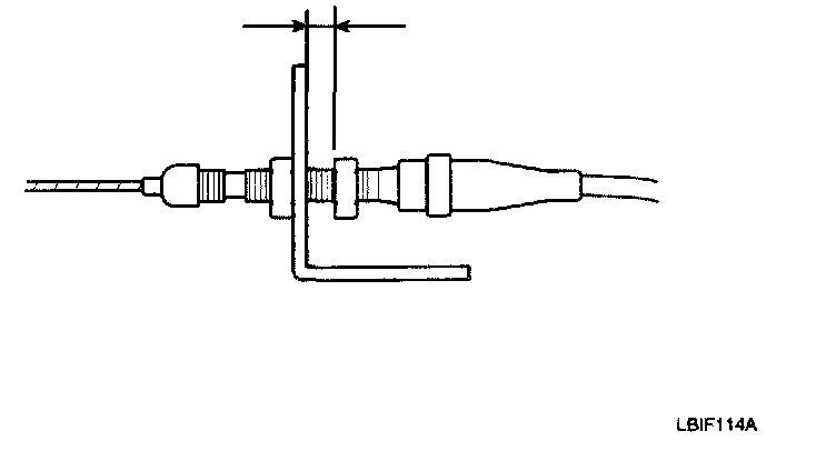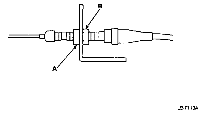 5. Turn the adjusting nut (A) until it is 3.75 ± 0.5 mm (0.15 ± 0.02 in.) away from the bracket (B).