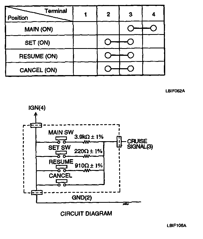 4. Check the continuity between the terminals of the connector in each switch position according to the table.
