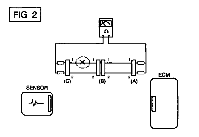 In [FIG.2.] the measured resistance of line 1 and 2 is higher than 1 MOhm and below 1 Ohm respectively. Specifically the open circuit is line 1 (Line 2 is normal). To find exact break point, check sub line of line 1 as described in next step.