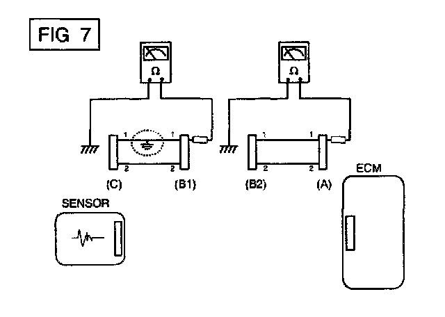 b. Disconnect connector (B), and measure the resistance between connector (A) and chassis ground, and between (B1) and chassis ground as shown in [FIG. 7]