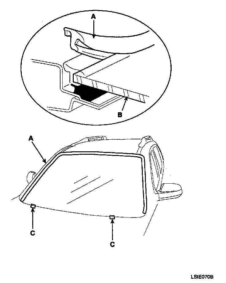 3. Apply the glass primer (A) to the side of the windshield glass edge and stick the both-sided adhesive tape (B) on the inside of molding (C).