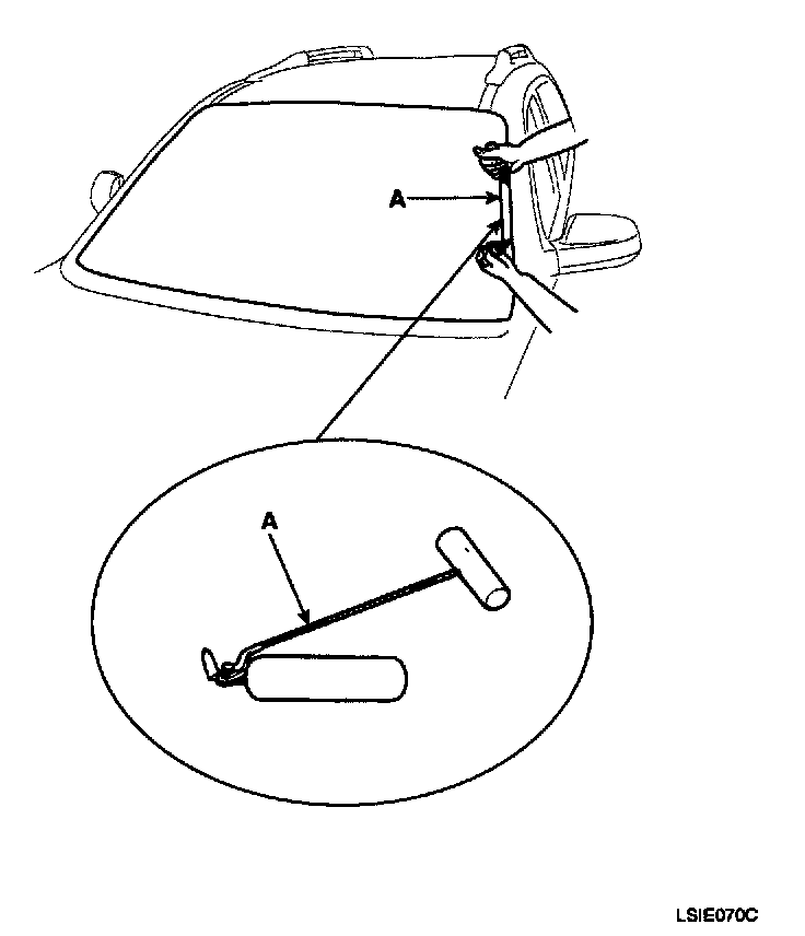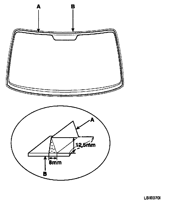 2. Remove the molding (A) from the edge of the windshield (B). If necessary, cut the molding with a utility knife.