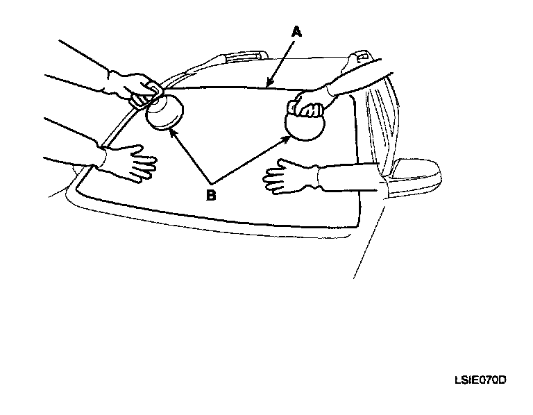 10. Use glass holder (A) to hold the windshield over the opening, align it with the alignment marks (B) made in step 15, and set it down on the adhesive. Lightly push on the windshield until its edges are fully seated on the adhesive all the way around. Do not open or close the doors until the adhesive is dry.