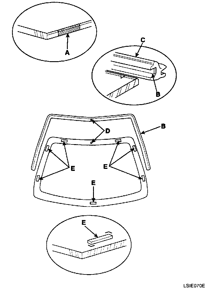 4. When attaching the molding, make it in line (D) with the windshield glass and attach the windshield glass pad (E)to the designated place.