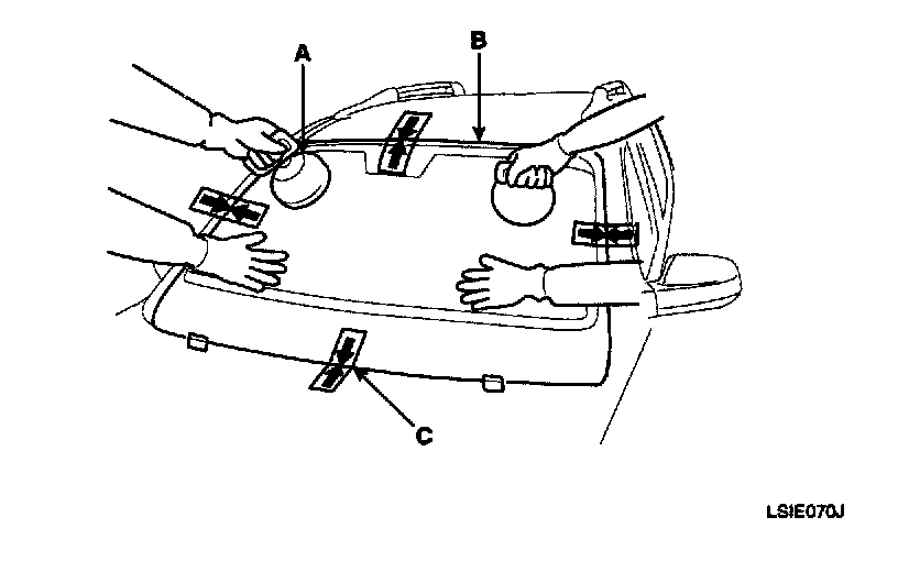 5. Install the spacer (A) install the windshield glass (B) temporarily with making sure to position them on the center, and then place the alignment mark (C).