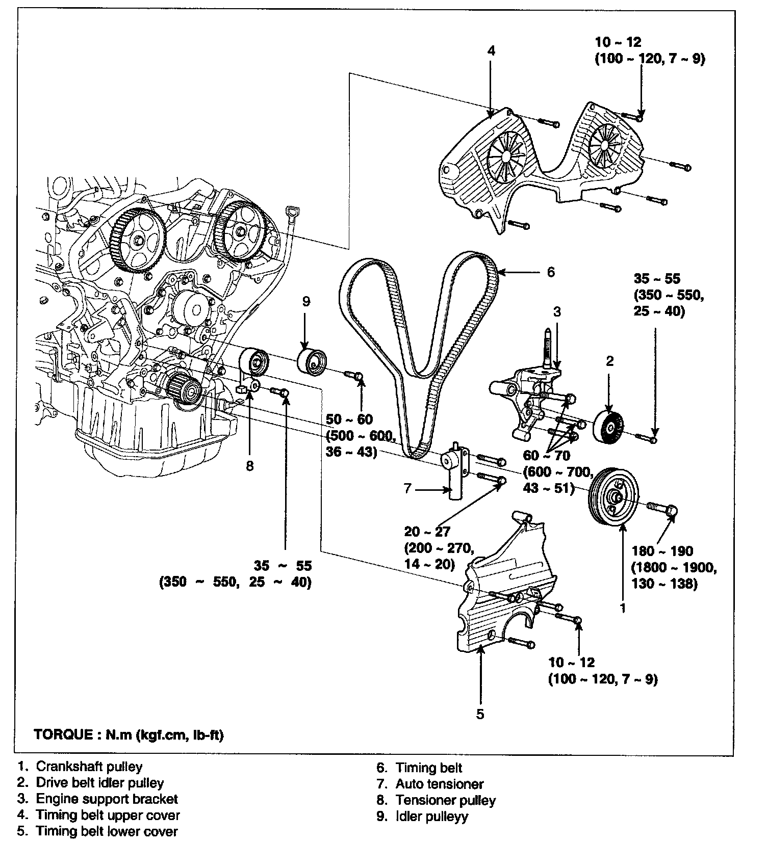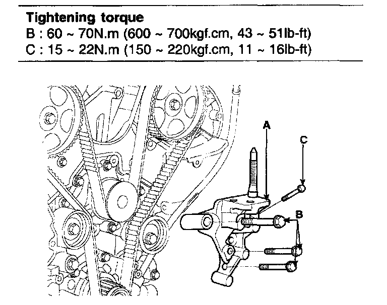 Idler pulley bolt 50 - 60 Nm (500 - 600 kgf.cm, 36 - 43 ft. lbs.)