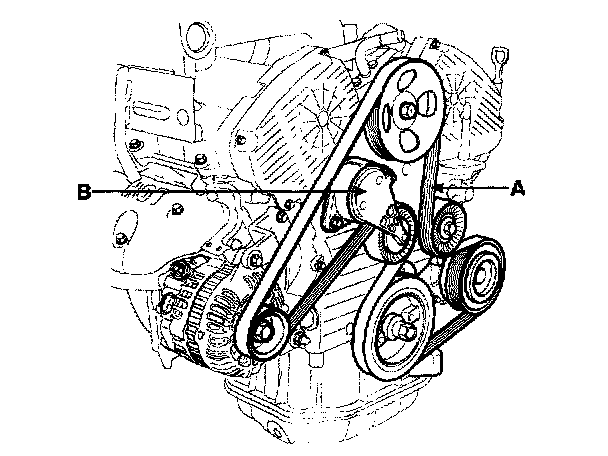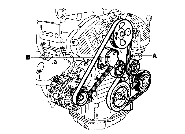 16. Install the drive belt tensioner (B) and drive belt (A).