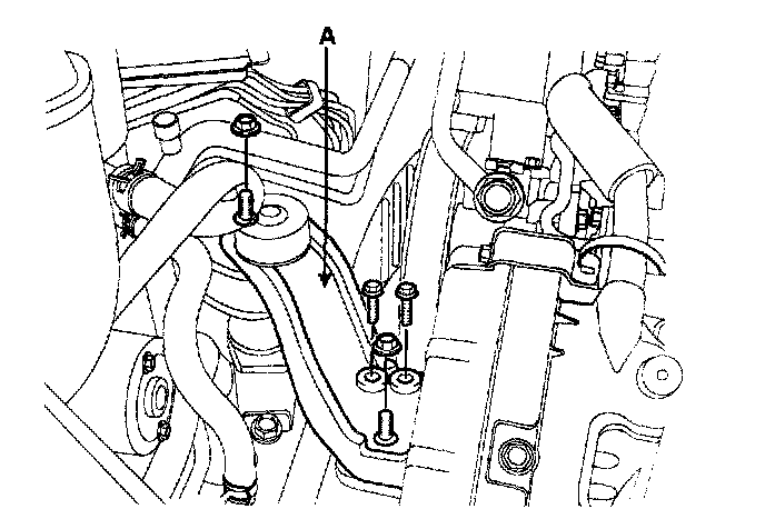 2) Remove the 2 bolts, 2 nuts and engine mount bracket (A).