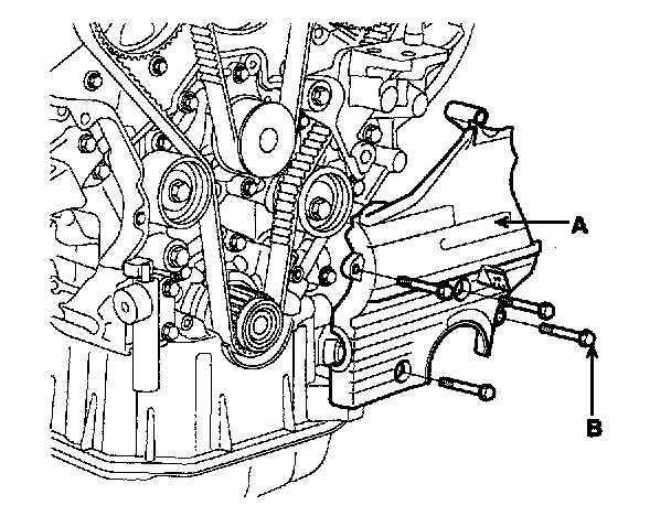 11. Remove the 4 bolts (B) and timing belt lower cover (A).