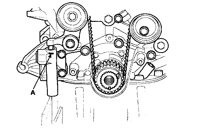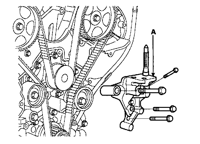 14. Remove timing belt tensioner. Alternately loosen the 2 bolts, and remove the tensioner (A).