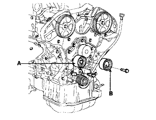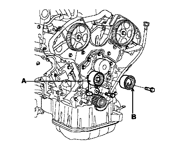 16. Remove the tensioner pulley (A) and timing belt idler pulley (B).