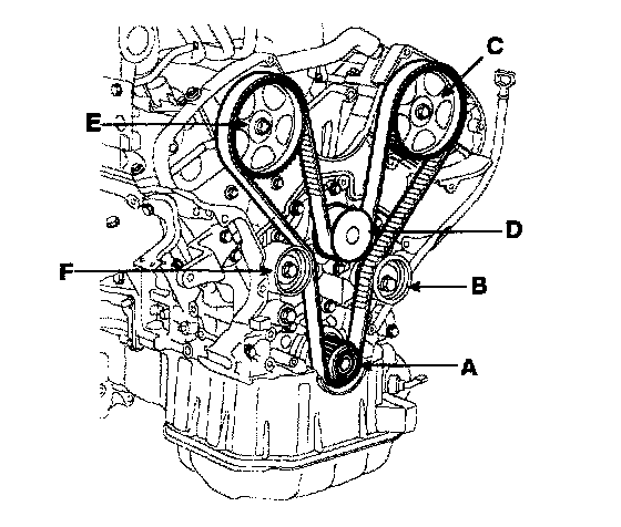 Crankshaft sprocket (A) - Idler pulley (B) Camshaft sprocket LH side (C) - Water pump pulley (D) - Camshaft sprocket RH side (E) Tensioner pulley (F).