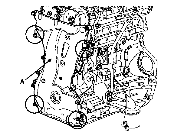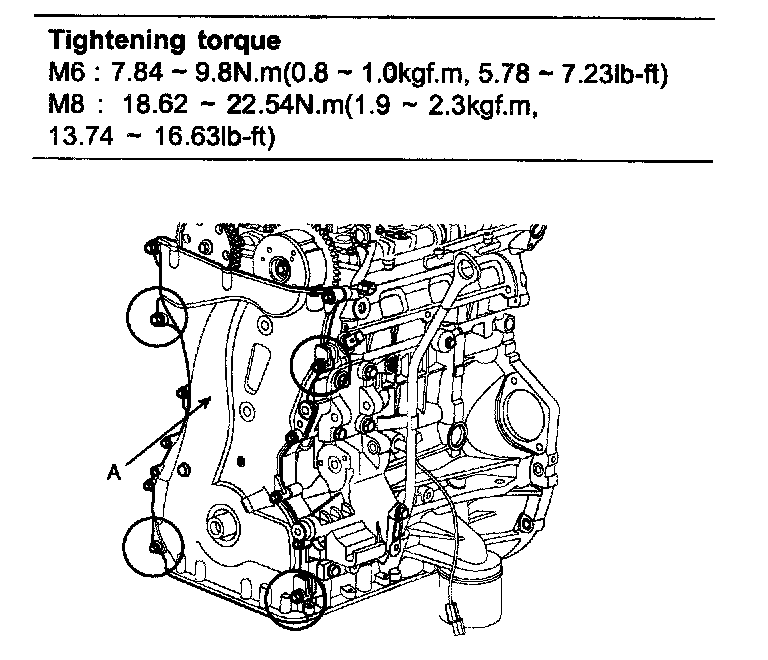 4) The dowel pins on the cylinder block and holes on the timing chain cover should be used as a reference in order to assemble the timing chain cover (A) to be in exact position.