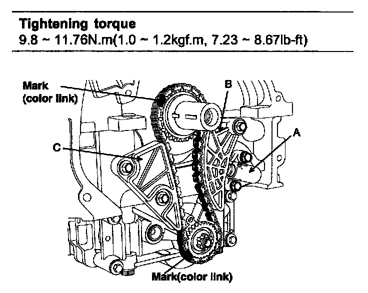 The timing mark of each sprockets should be matched with timing mark (color link) of timing chain at installing timing chain.
