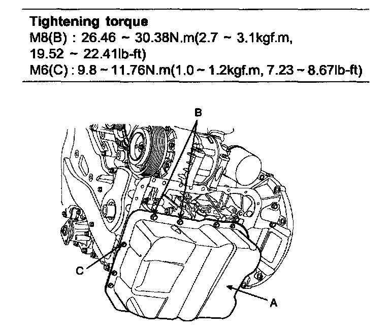 3) Install oil pan (A). Uniformly tighten the bolts in several passes.