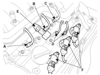 (3) Disconnect the injection connectors(A,B,C), the ground lines(D), the condenser connector(E) and the Ignition coil connectors(F).