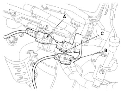 (8) Disconnect the bank 2 front/rear O2 sensor connectors(A,B) and the CKP sensor connector(C).