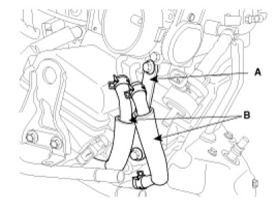 5. Remove the ETC(Electric Throttle Control) bracket(A) and the cooling hoses(B).