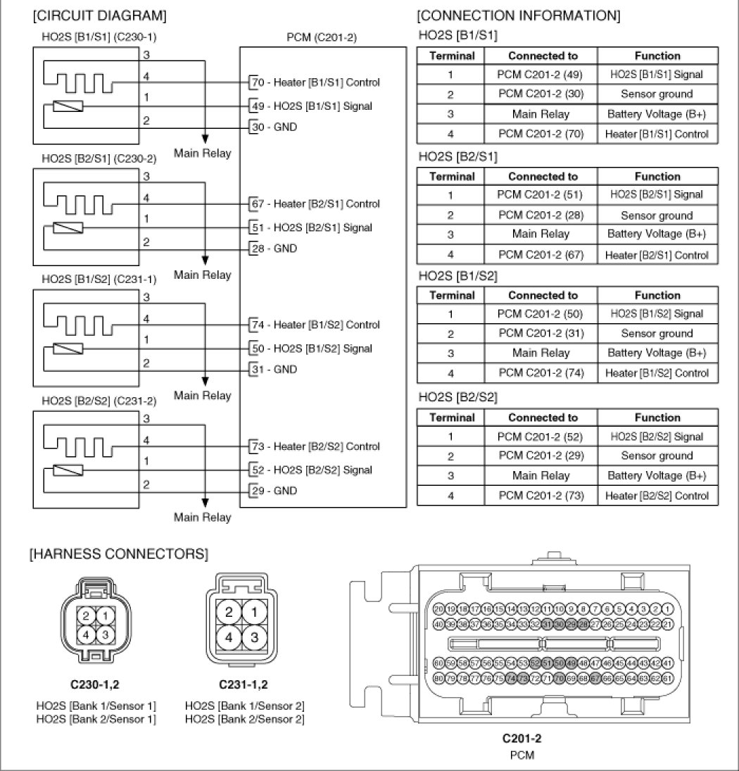 Heated Oxygen Sensor (HO2S) consists of zirconium and alumina and is installed on upstream and downstream of the Manifold Catalyst Converter (MCC). After it compares oxygen consistency of the atmosphere with the exhaust gas, it transfers the oxygen consistency of the exhaust gas to the PCM. When A/F ratio is rich or lean, it generates approximately 1V or 0V respectively. In order that this sensor normally operates, the temperature of the sensor tip is higher than 370°C (698°F). So it has a heater which is controlled by the PCM duty signal. When the exhaust gas temperature is lower than the specified value, the heater warms the sensor tip.