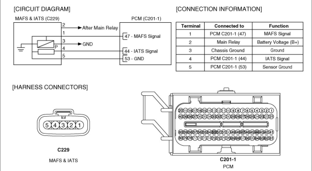 Mass Air Flow Sensor (MAFS) is a hot-film type sensor and is located in between the air cleaner and the throttle body. It consists of a tube, a sensor assembly and honeycomb cell and detects intake air quantity flowing into the intake manifold. Air flows from the air cleaner assembly through the honeycomb cell and over the hot film element. At this time, heat transfer is generated by convection and this sensor loses its energy. This sensor detects the mass air flow by using the energy loss and transfers the information to the PCM by frequency. The PCM calculates fuel quantity and ignition timing.