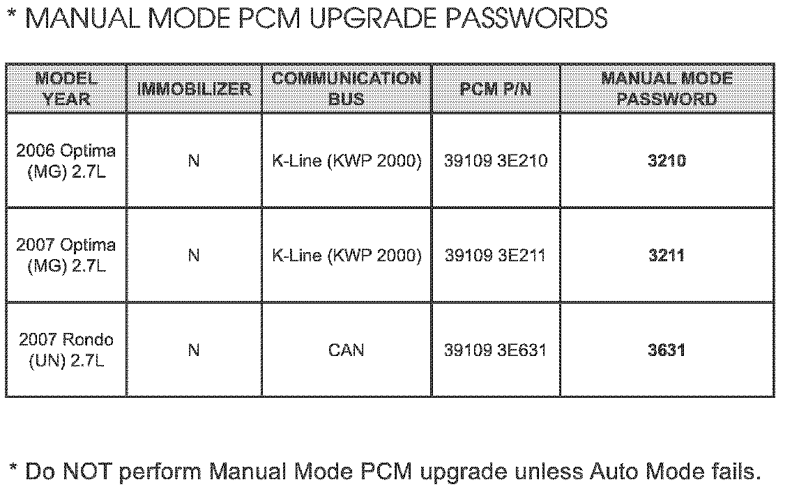 Do NOT attempt to perform a Manual Mode PCM upgrade unless Auto Mode fails. Always follow the instructions given on the GDS tool in either Auto or Manual mode. Refer to table above for Manual Mode passwords.