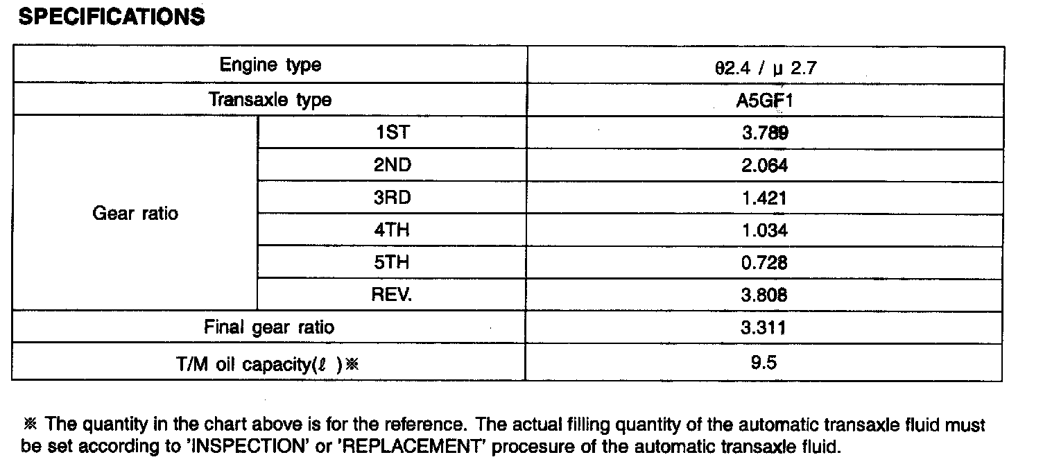** The quantity in the chart above is for the reference. The actual filling quantity of the automatic transaxle fluid must be set according to 'INSPECTION' or 'REPLACEMENT' procedure of the automatic transaxle fluid.