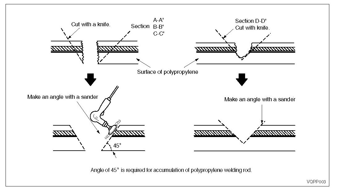 Damage to the bumper that reaches the surface of the polypropylene cannot be fixed just by painting. Use the repair methods shown below to repair damage that reaches the surface of the polypropylene.