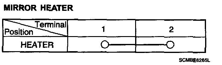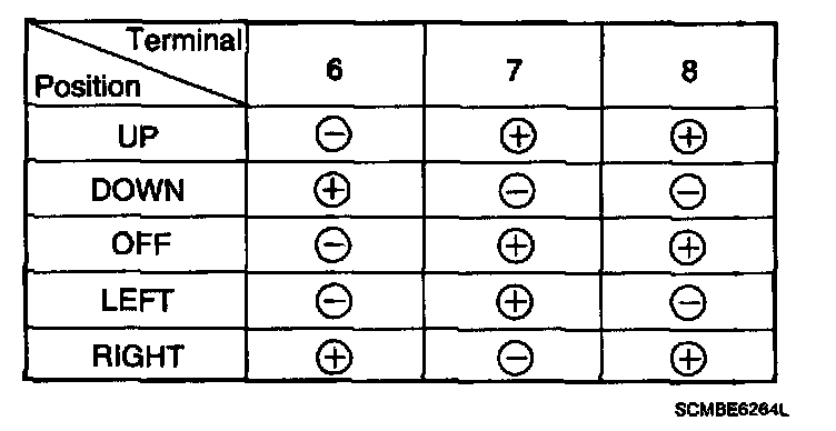 2. Apply battery voltage to each terminal as shown in the table and verify that the mirror operates properly.
