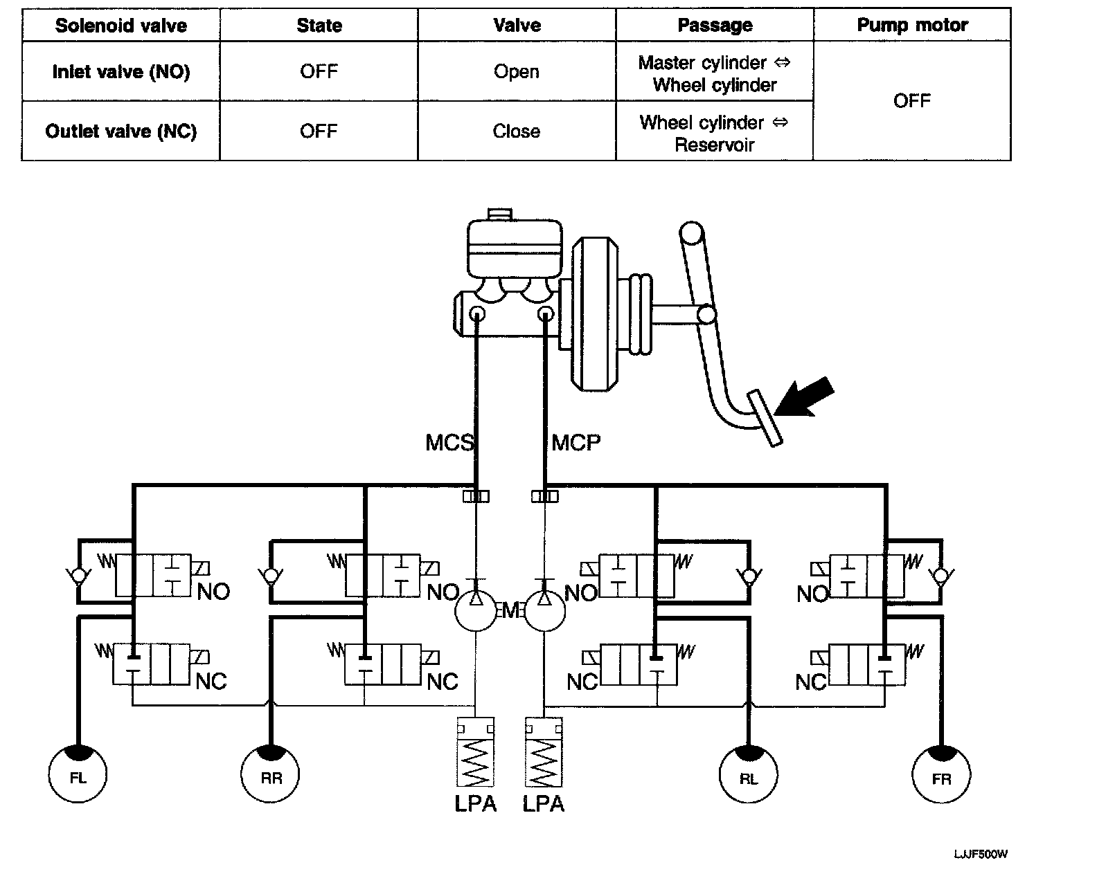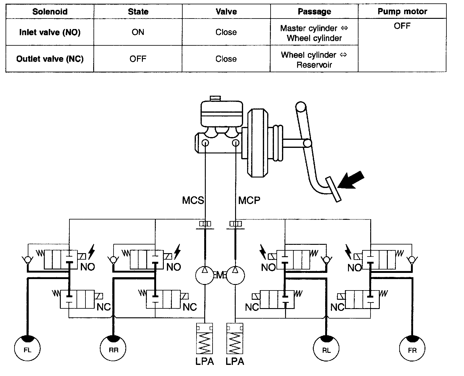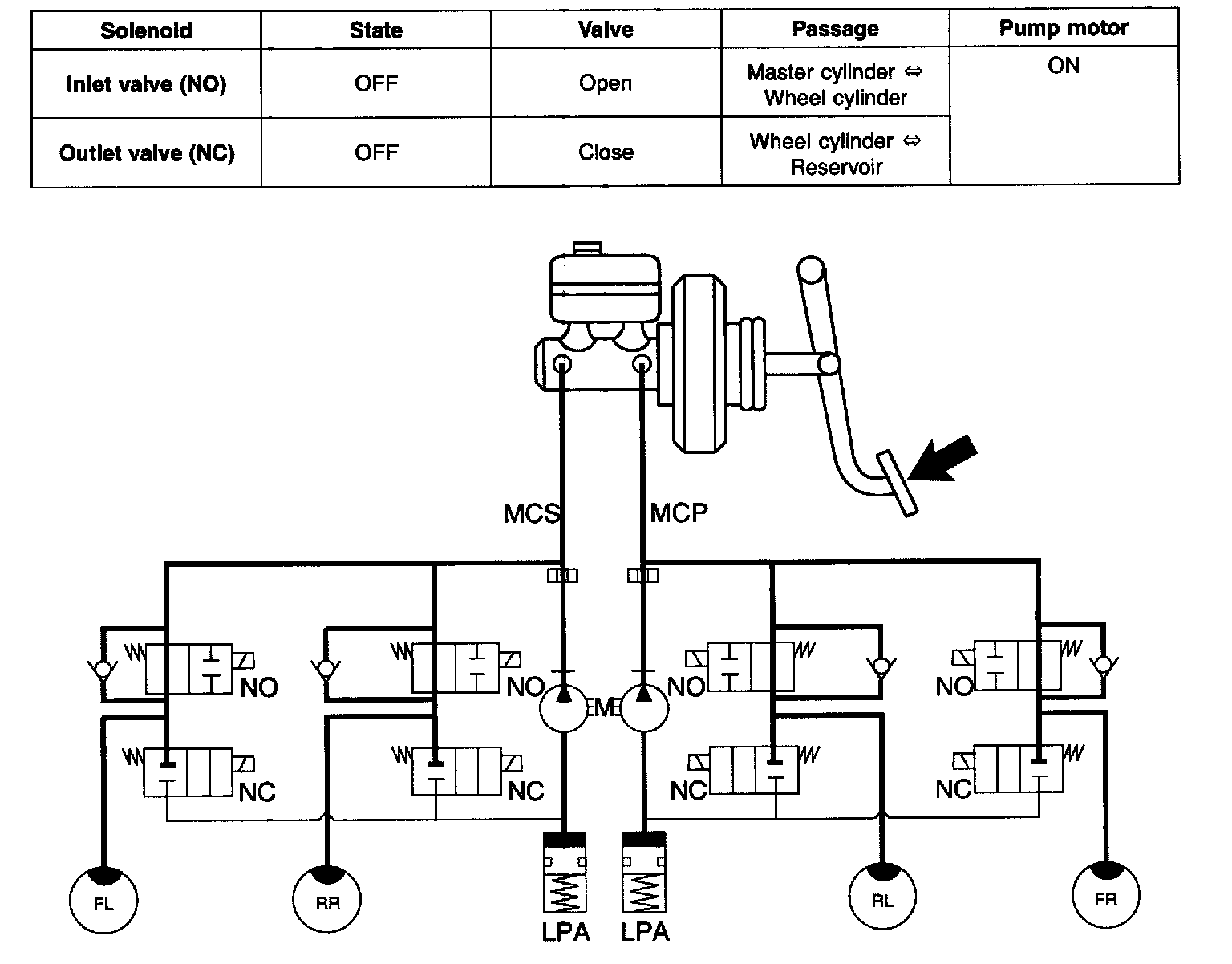 If HECU determines there's no lock-up in the wheel, HECU cuts voltage to solenoid valve. So voltage is not supplied to each solenoid valve, brake fluid passes through the inlet valve to wheel cylinder, resulting in pressure increase.