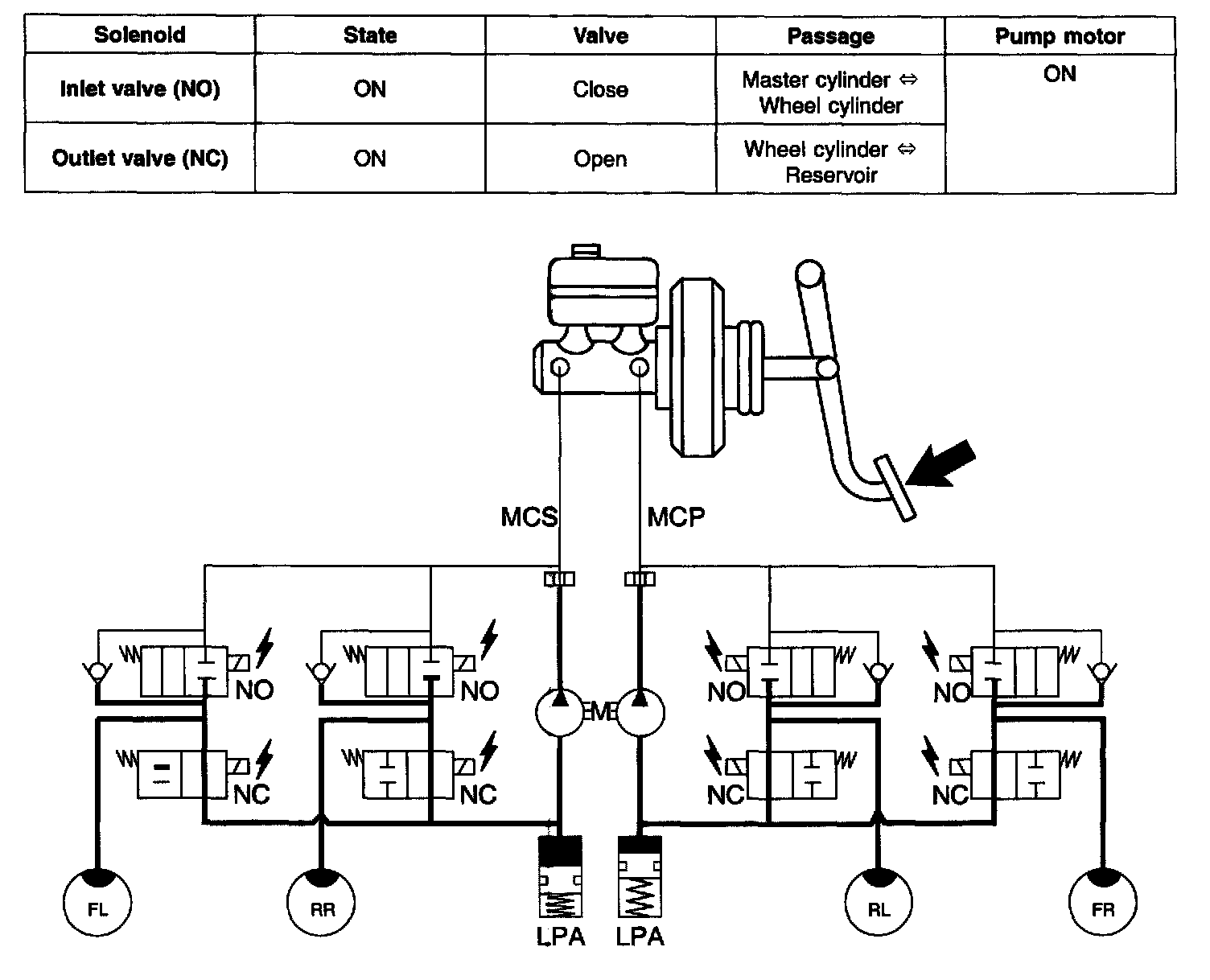 Under the normal braking, voltage is not supplied to solenoid valve, inlet valve is opened and outlet valve is closed.When the brake is depressed, brake fluid is supplied to the wheel cylinder via solenoid valve to activate the brake.When the brake is released, brake fluid is back to the master cylinder via inlet valve and check valve.