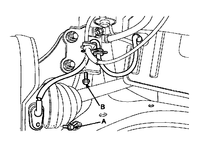 1. Remove the front wheel speed sensor mounting bolt (A) and cable mounting bolt (B).