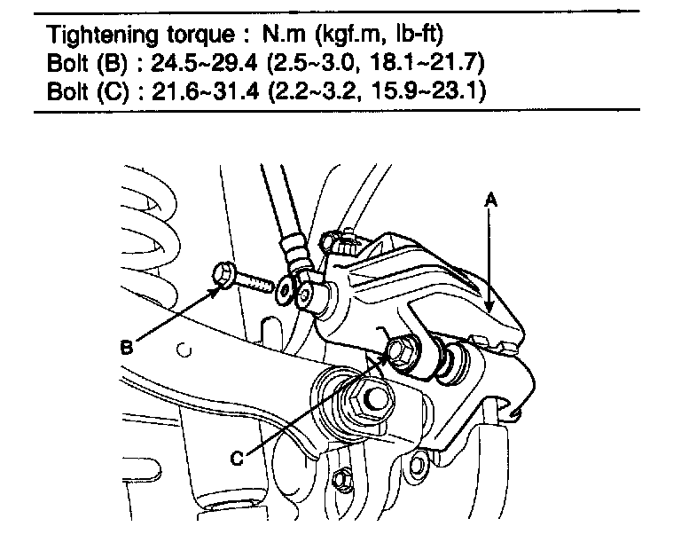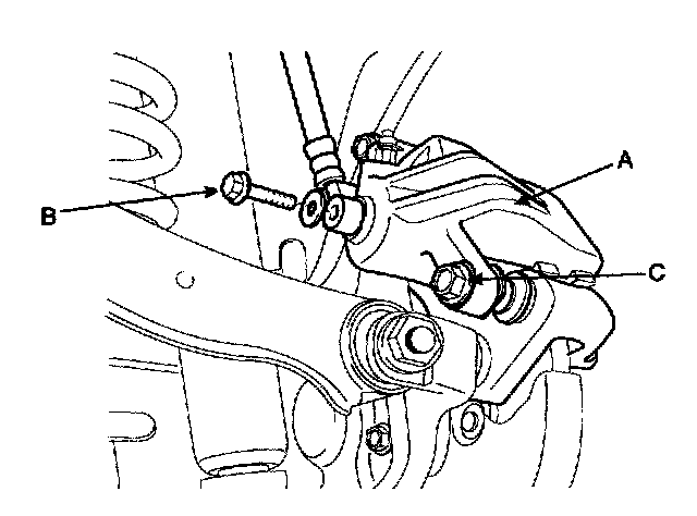 1. Remove the brake hose bolt (B) and the guide rod bolts (C) from the caliper assembly (A).