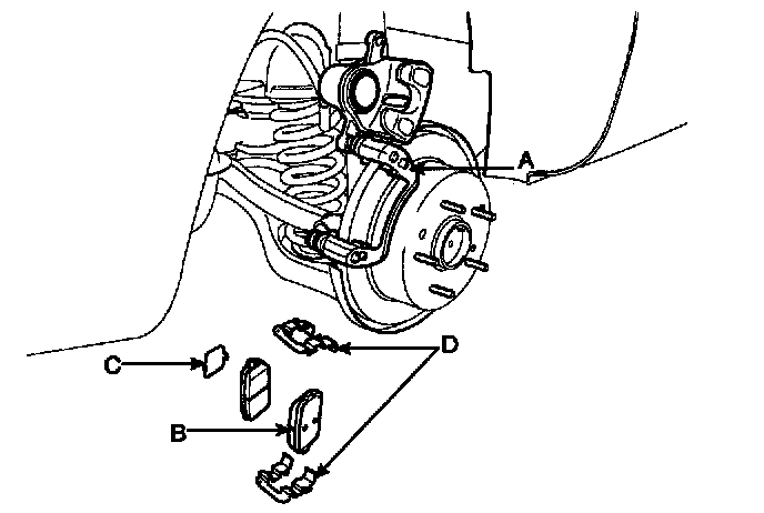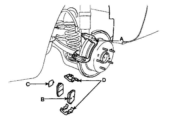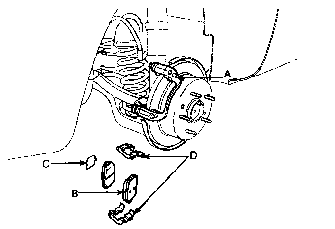 3. Remove the pads (B), the pad shims (C) and the pad retainers (D) from the caliper bracket (A).