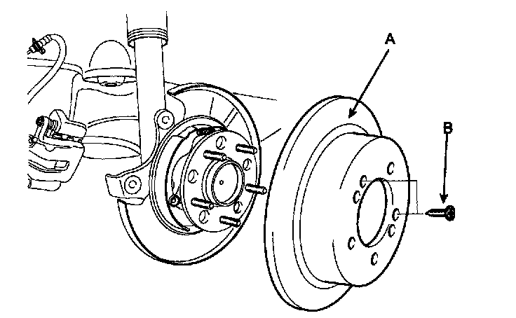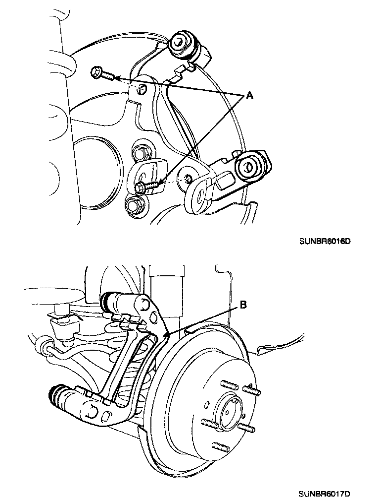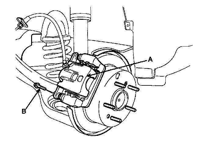 5. Remove the caliper bracket (B) and the caliper mounting bolts (A).