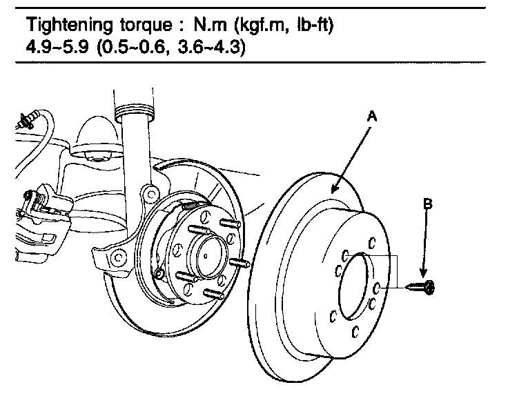 2. Install the caliper bracket (B) and tighten the caliper mounting bolts (A).