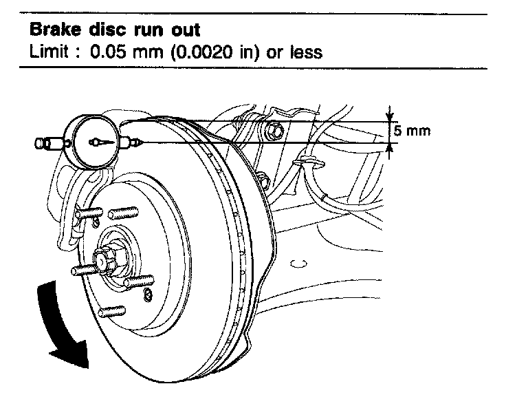 1. Place a dial gauge about 5mm (0.2 in) from the outer circumference of the brake disc, and measure the run out of the disc.