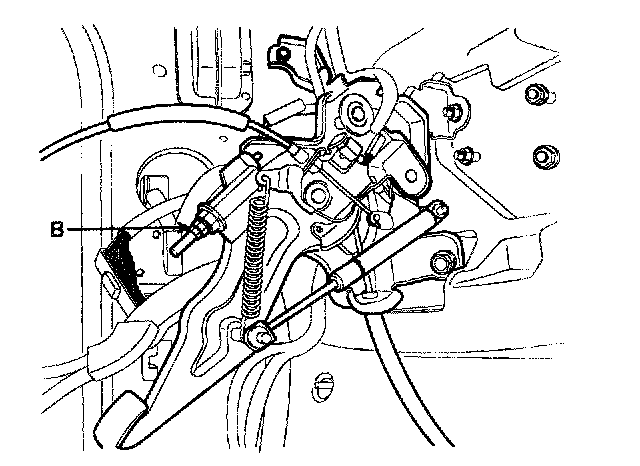 Adjust the nut (B) so that the parking brake pedal stroke is 88 - 98mm(3.46 - 3.86in) at an operating effort of 196N(20kgf, 441b).