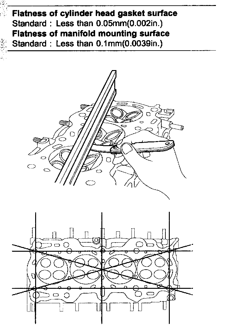 Using a precision straight edge and feeler gauge, measure the surface the contacting the cylinder block and the manifolds for warpage.