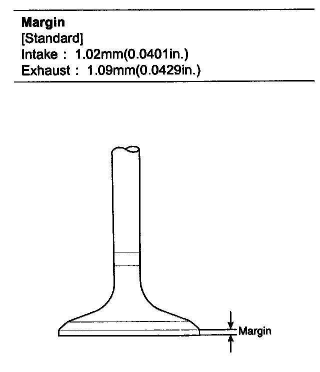 3) Check the valve head margin thickness. If the margin thickness is less than minimum, replace the valve.