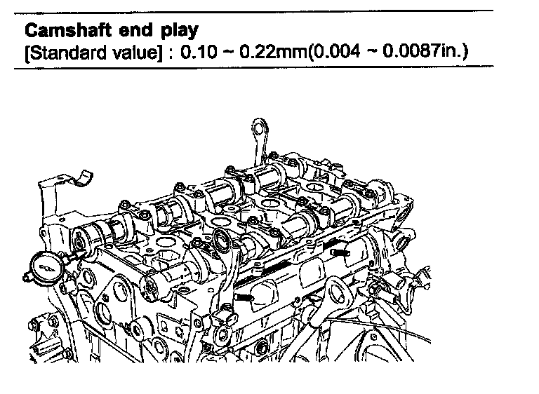 2) Using a dial indicator, measure the end play while moving the camshaft back and forth.