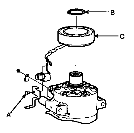4. Remove the screw (A) from the field coil ground terminal. Remove the retainer ring (B) and then remove the field coil (C) from the shaft with a puller. Be careful not to damage the coil and compressor.