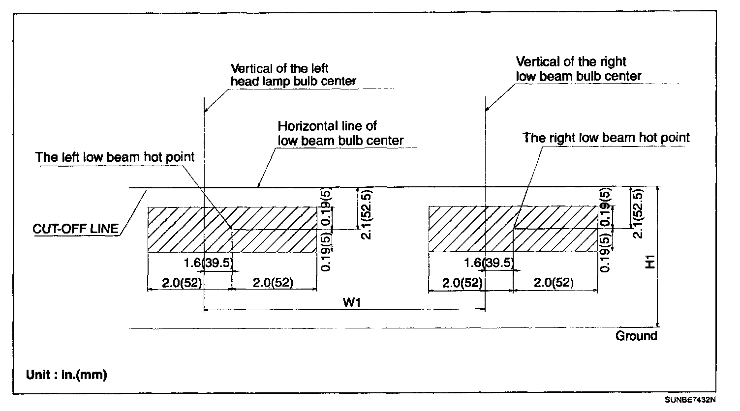 4. With the head lamp and battery in normal condition, aim the head lamps so the brightest portion falls on the vertical lines.